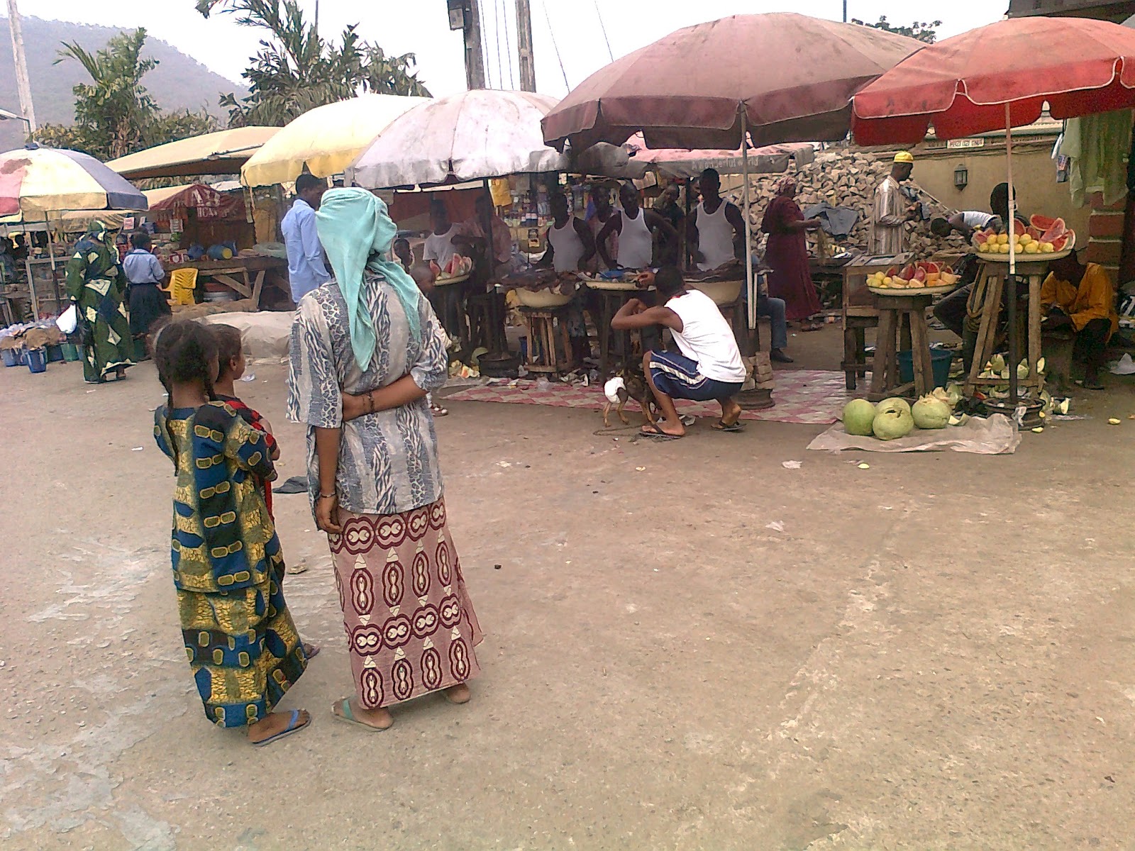 (indescribable gaily-dressed dog in town), but somewhat indescribable all the same. A travelling puppy feeding on barbeque at Lokoja in Kogi State, Nigeria on its way to Abuja.